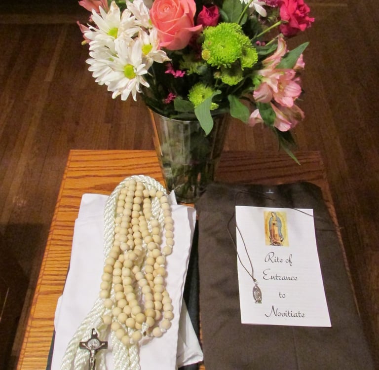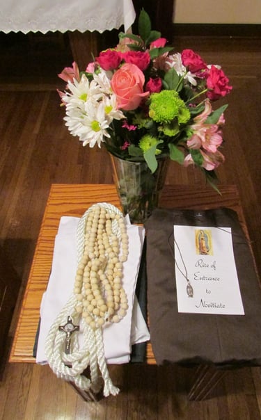 Our Novices are invested with a white scapular, a sign of purity and of her consecration to Our Lady as well as a commitment to live out her vocation with the Blessed Virgin Mary as her role model and intercessor. The veil is our helmet of salvation and hope, a sign of her humility and unfailing obedience and of her firm intention to turn her eyes away from foolish vanities.